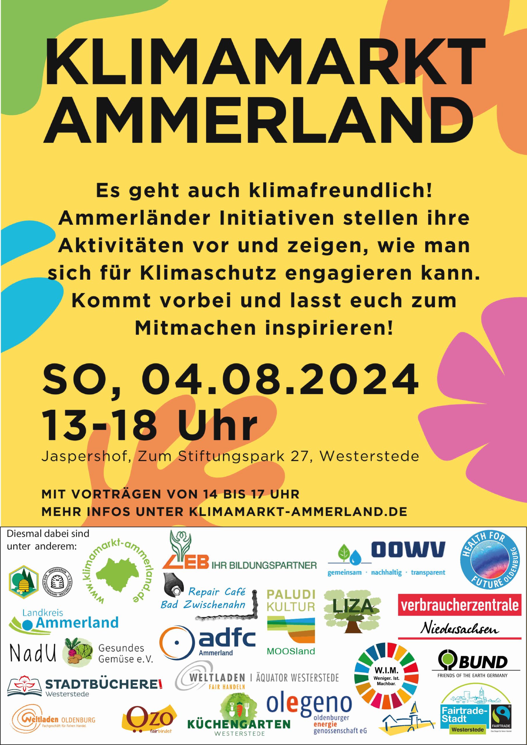 Der Klimamarkt 2024 fand bei bestem Wetter auf dem Jaspershof in Westerstede statt. 25 Organisationen nahmen teil, hier die Liste der Teilnehmenden. Und hier geht es zum Bericht über den Klimamarkt 2024